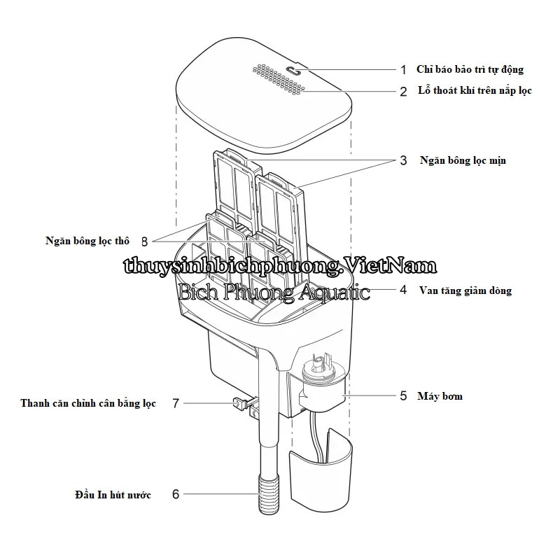 - Đầu hút nước thẳng, trong suốt và điều chỉnh được chiều cao phù hợp cho nhiều kích thước bể.