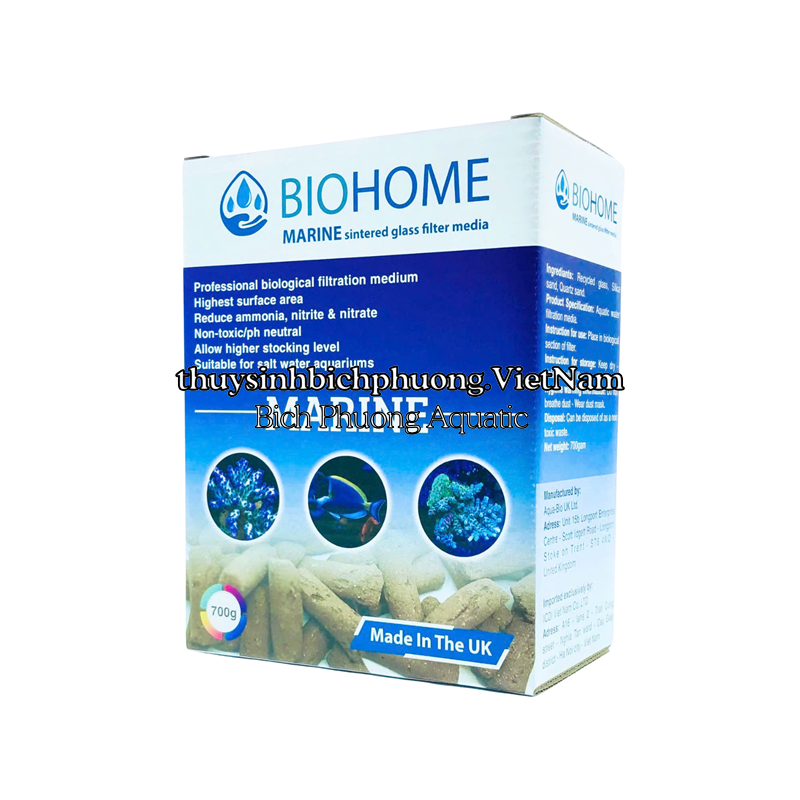 BIOHOME MARINE là vật liệu lọc sinh học cao cấp dành cho hồ cá biển được sản xuất bởi Aqua-Bio UK Ltd, một công ty có trụ sở tại Vương quốc Anh. Sản phẩm này được thiết kế để tối ưu hóa quá trình xử lý amoniac, nitrit và nitrat trong nước, giúp duy trì môi trường sống lành mạnh cho hồ cá biển.
