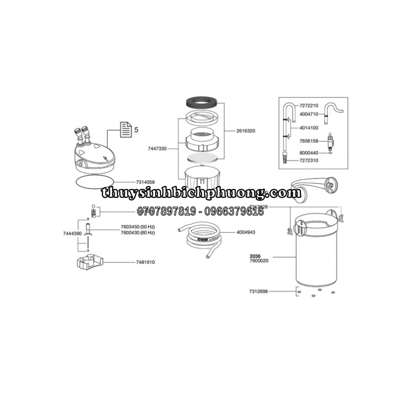 - Phụ kiện đi kèm: 2 vòi đóng ngắt, cút xả, ống vào, vòi chất lượng EHEIM, phụ kiện lắp đặt.
