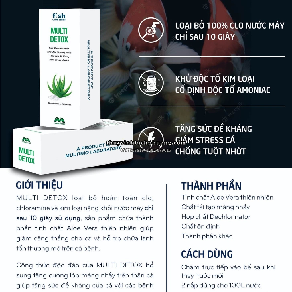 MULTI DETOX loại bỏ hoàn toàn chlorine, chloramine và kim loại nặng khỏi nước máy chỉ sau 10 giây khi sử dụng, sản phẩm chứa thành phần tinh chất aloe vera thiên nhiên giúp giảm căng thẳng cho cá và hỗ trợ làm lành tổn thương mô trên cá.